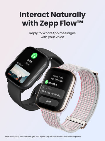 Zepp Flow™ makes it even easier to keep up with your friends and family, too. Not only can you now receive and view picture messages from apps like WhatsApp right on your Amazfit Active - you can even use your voice to reply. Just engage Zepp Flow™ using the crown and say your reply aloud. Easy.