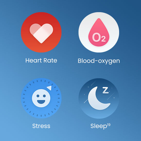 17. 24-hour monitoring of heart rate and blood-oxygen saturation (SpO₂) need to be enabled in the Zepp App. For heart rate monitoring, the user must enable Auto Heart Rate Monitor in the Zepp App, and the minimum value can be set to 1 minute. Abnormal heart rate alerts and the preset value need to be set in the Zepp App. To measure blood-oxygen saturation (SpO₂), please wear the watch tightly at one finger-width from the wrist, and keep your arm still for best results. SpO₂ alerts are sent if the detected rate is too low compared to the preset value, which needs to be set in the Zepp App, at a minimum of 80%. Movement, and environmental and physical characteristics can affect speed and accuracy of monitoring and measurement. The 24-hour stress level monitoring needs to be enabled on the watch or in the Zepp App. Alerts for high stress levels are based on the preset value, and prompts for the breathing exercise need to be enabled on the watch. To process the one-tap measurement and other manual metric measurements, please wear the watch tightly at one finger-width from the wrist, and keep your arm still for best results. Movement, and environmental and physical characteristics can affect speed and accuracy of monitoring and measurement.