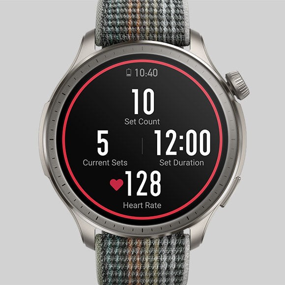 9. Smart recognition of strength training exercises can only be engaged within the Strength Training sports mode. 25 exercises are able to be recognized at time of product release, including: Bodyweight squats, Bodyweight straight arm front squats, Barbell squats, Tricep pushdowns, Bent over rows, Barbell bench press, Sit-up holds, Knee-touch sit-ups, Dumbbell flys, Burpees, Burpee jumps, Overhead tricep extensions, Lying tricep extensions, Lateral raises, Jumping jacks, Lat pulldowns, Deadlift, Push-up, Shoulder press, Pull up, Bicep curls, Seated cable rows, Dumbbell drag curls, Straight-arm pulldowns, Russian twists. If an exercise is not auto-recognized by watch, the Zepp App can provide a list of muscle groups or exercise names to choose from.