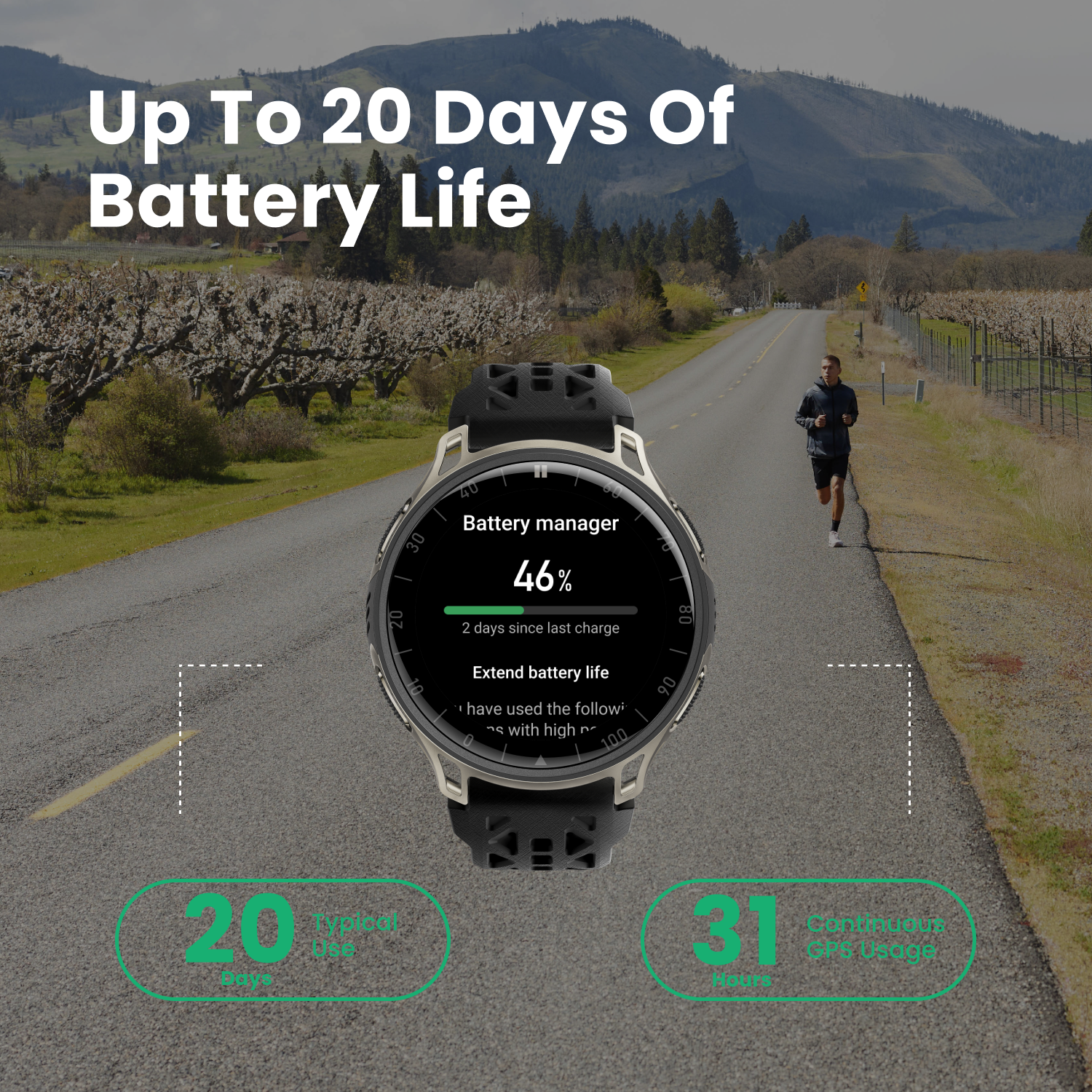 GPS Continuous Use Time (Accuracy Mode; dual-band, all satellite systems): Continuous GPS activity, heart rate always on, including watch trajectory recording.